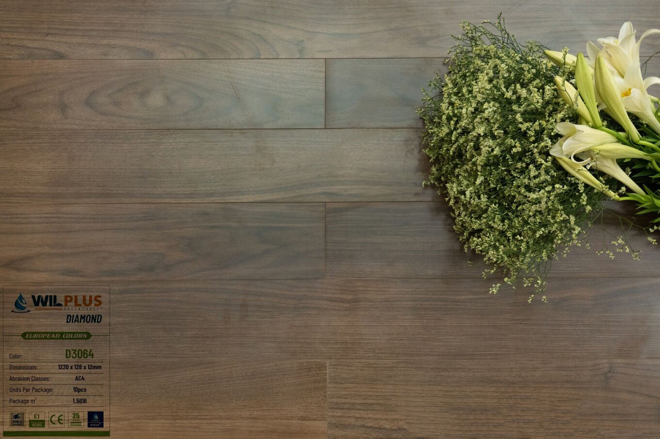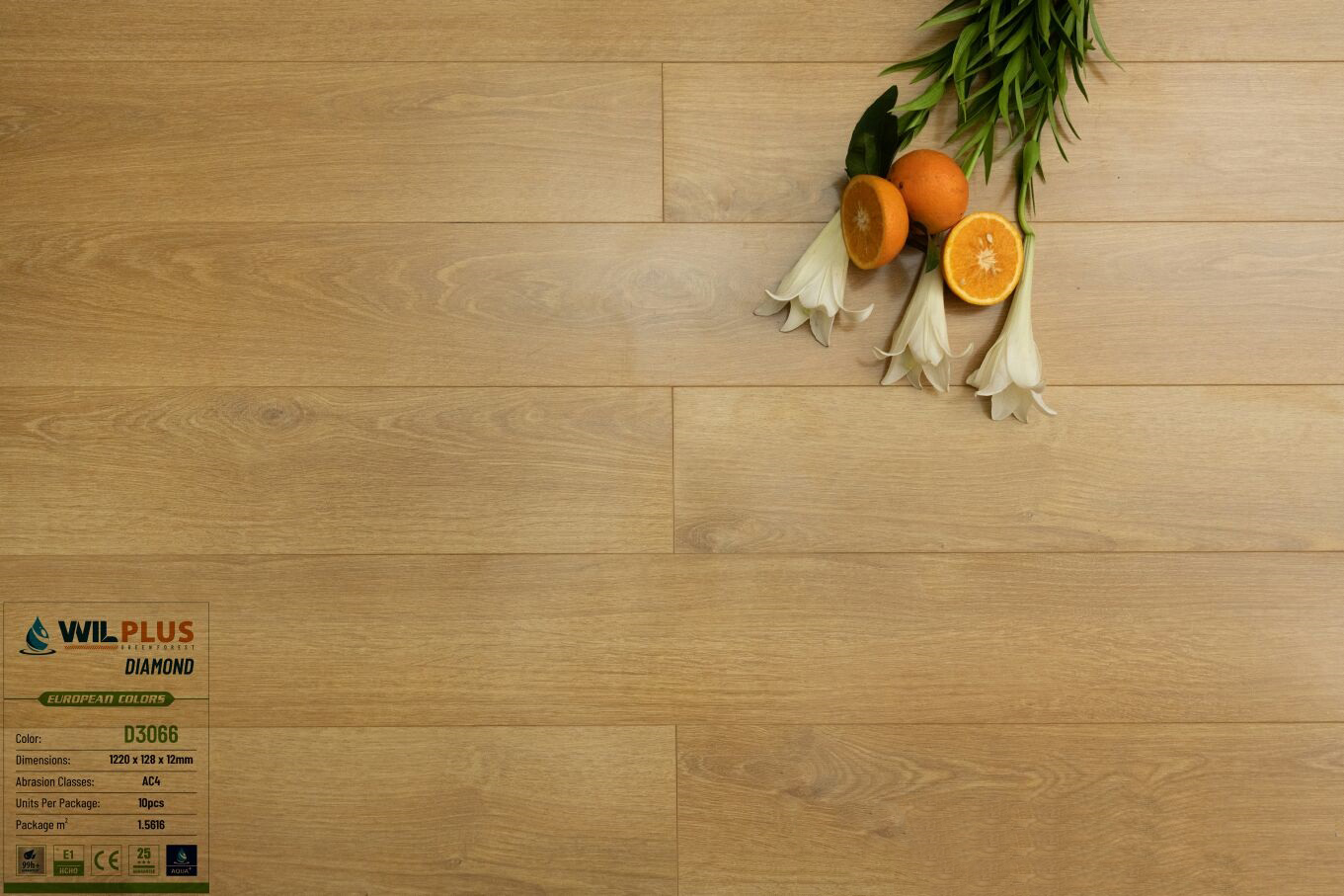 - Cốt HDF trắng 12mm, AC4, chống nước 99h.